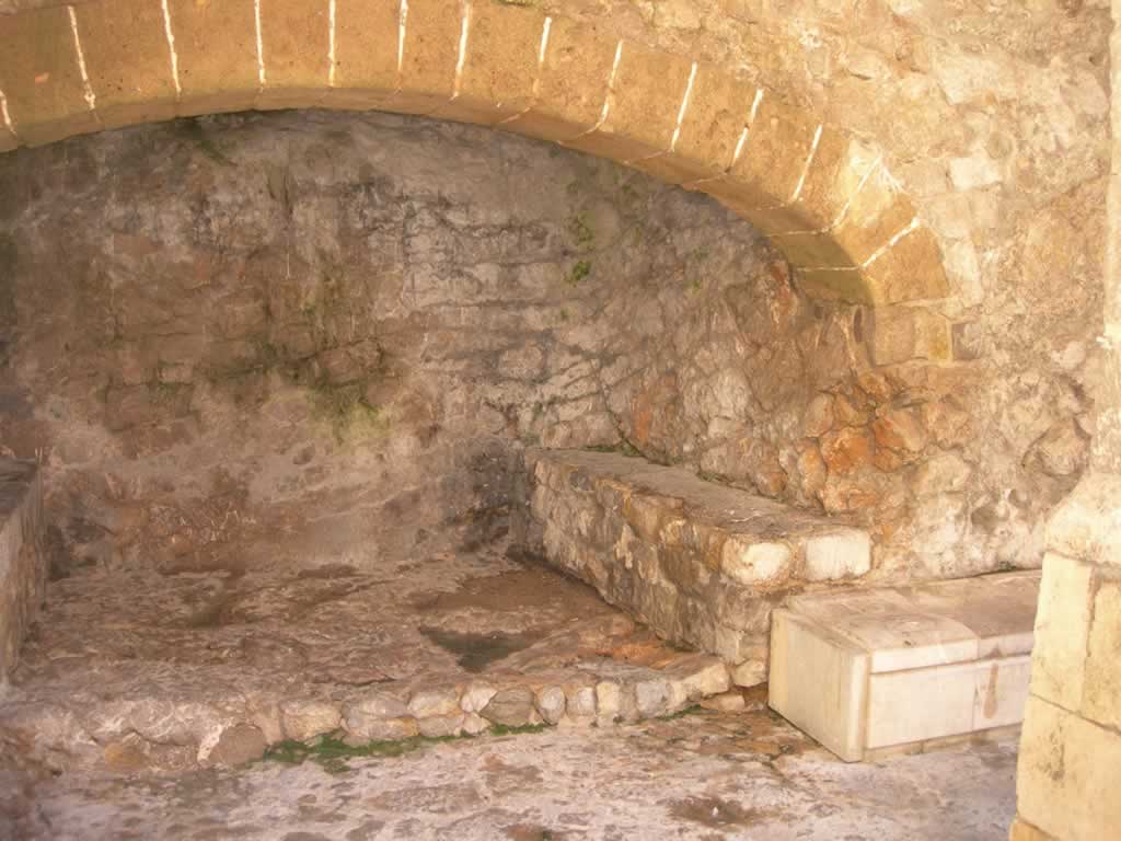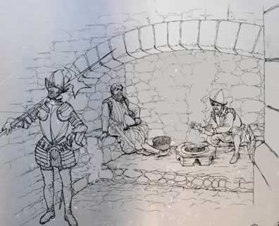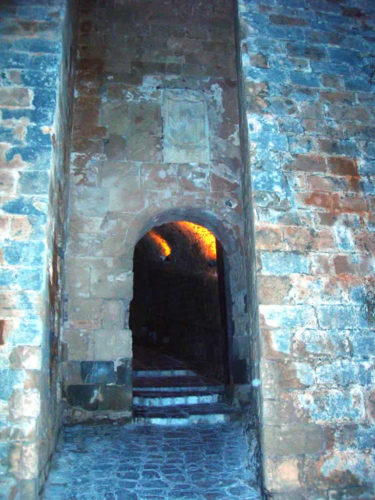 A portcullis used to protected the gateway. Notice the thickness of the wooden gates, there are 2 sets. Also notice the thickness of the walls as you walk through into a courtyard, Placa d' Armes. Immediately opposite the gate way you will see a recess, this is where the guards could sit down on two benches and the enclosurecontained a fireplace.