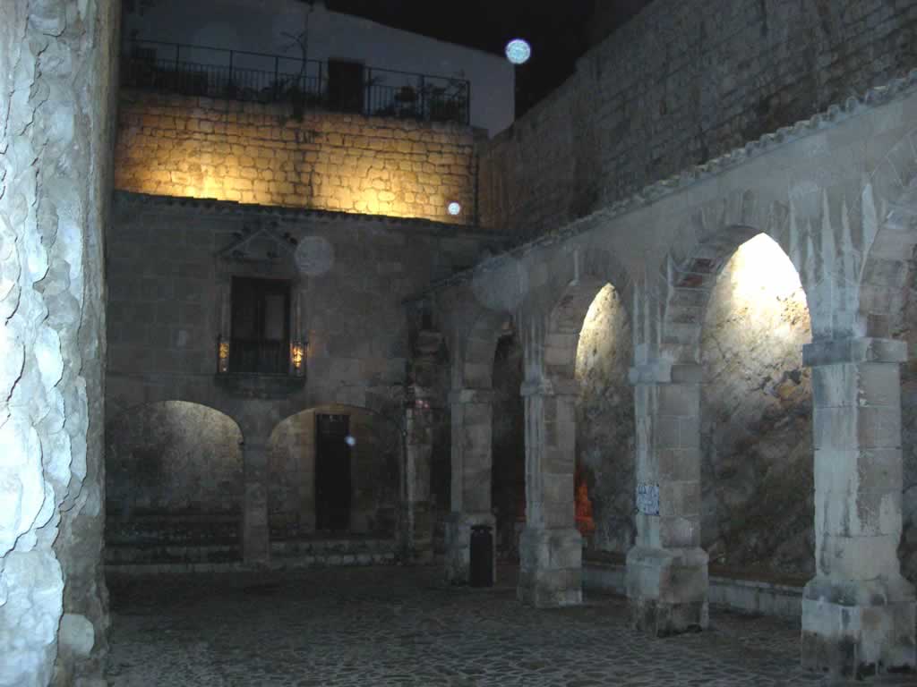 Day & night views of Gate Portal de ses Taules courtyard Placa d' armes Located at the back of the far archway on the right side is Guard resting position