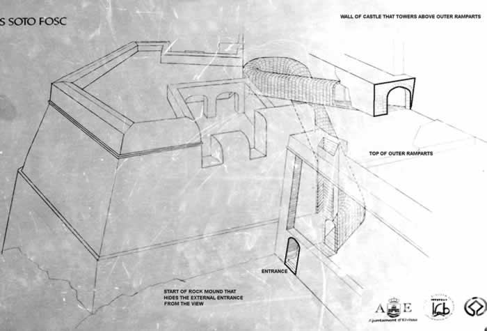 The external entrance is near the highest of the car parks that are at the rear of Dalt Vila accessed by C. del Calvari. The entrance built into the curtain wall by the right side of the Sant Bernat bastion is hidden by a mound of rock that would have also protected the entrance from cannon fire. The long steep tunnel winds up inside the walls doing a 270 degree twist. See drawing.