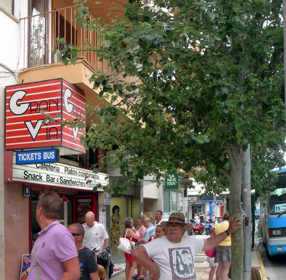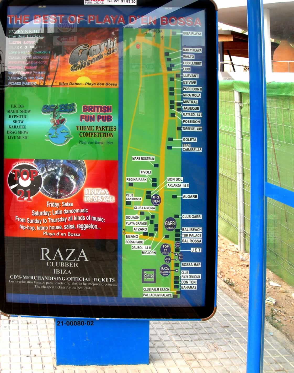 There are several Playa d' en Bossa (Platja d' en Bossa) and Es Viver bus stops roughly 300 to 500 metres apart that run along the road to the rear of sea front properties.